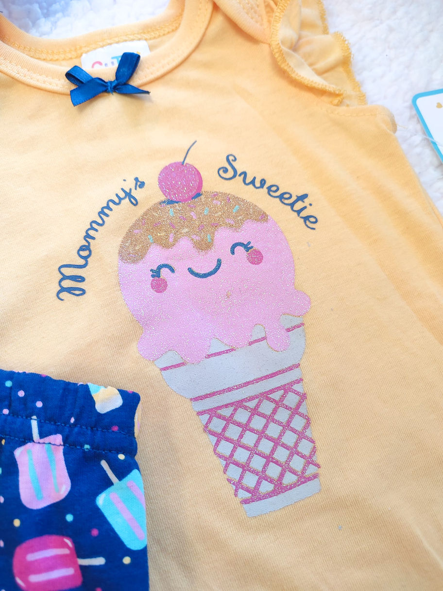 Get your little one ready for the warmer weather with our Mommy's Sweetie Short Outfit Set! This adorable set includes a yellow bodysuit with a sweet "Mommy's Sweetie" glittered ice-cream graphic, a pair of coordinating navy ice-cream theme shorts, and a pair of cute matching shoes to complete the look. The bodysuit features snap closures for easy dressing and nappy changes, while the shorts are made with a comfortable elastic waistband. The included shoes are soft-soled and perfect for little feet that are just starting to explore the world.